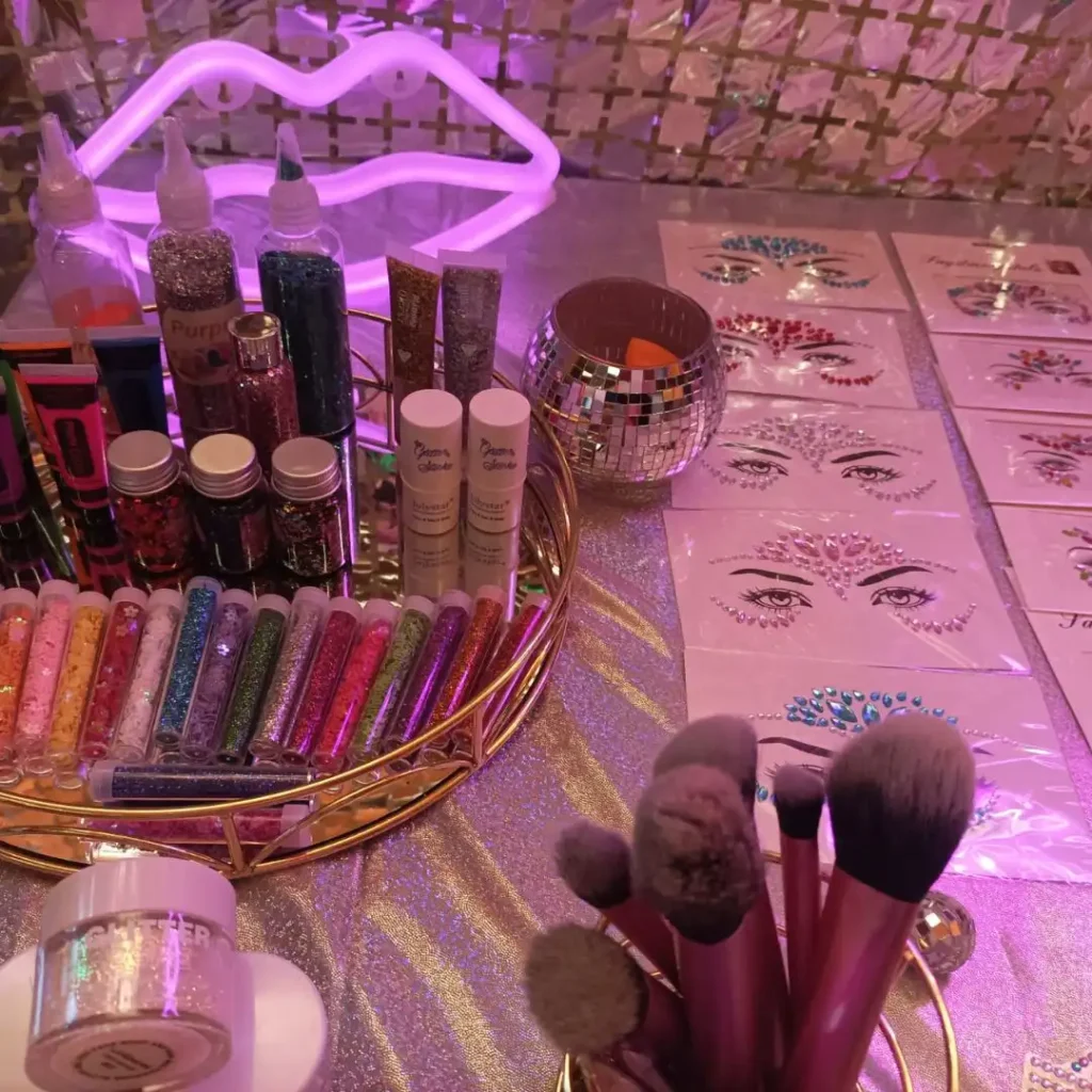 - Tendencia y diversión: La mesa glitter es la animación estrella en fiestas infantiles, comuniones y cumpleaños. Los niños disfrutan eligiendo sus diseños y luciendo brillos y colores durante todo el evento.